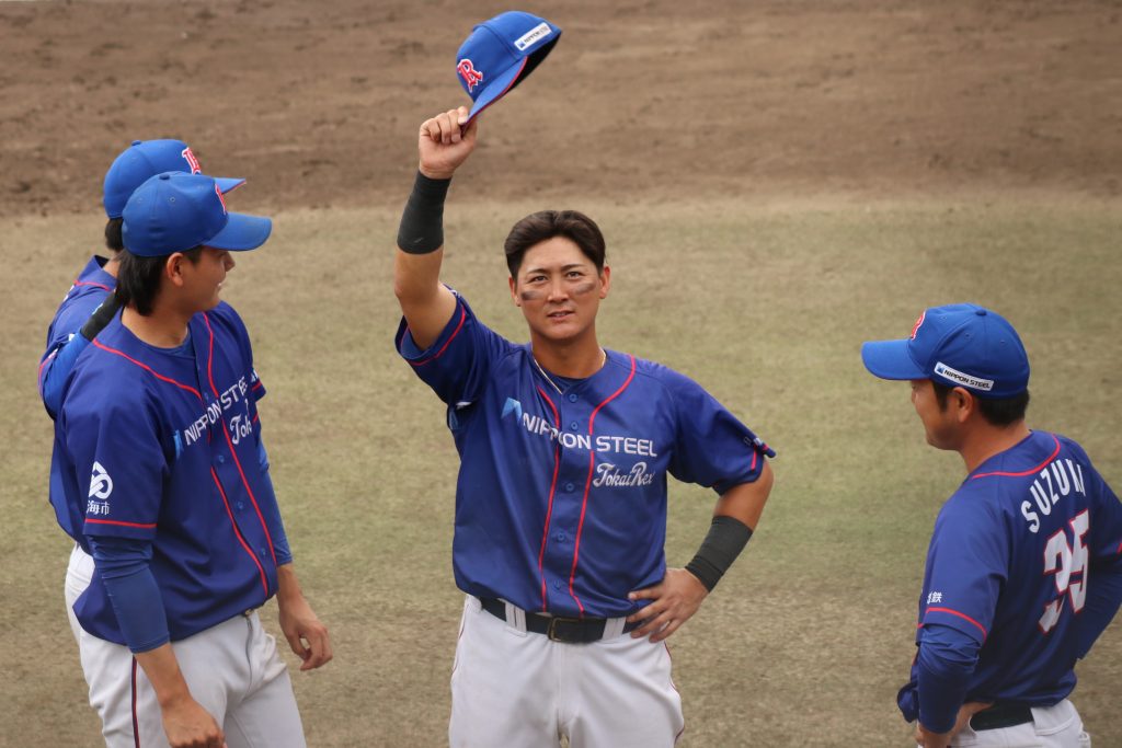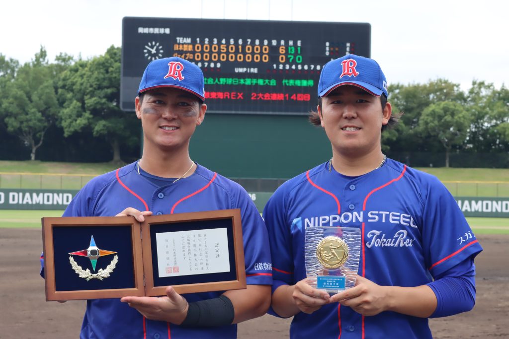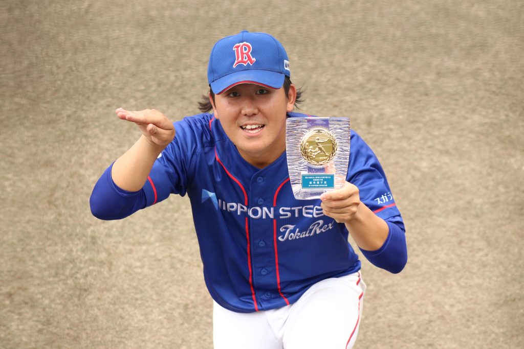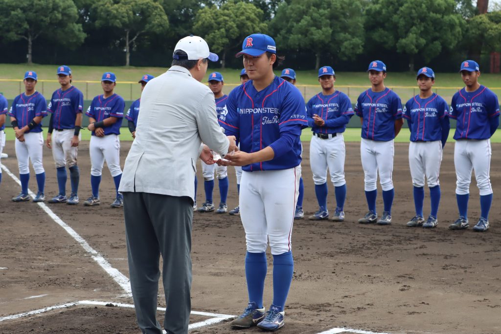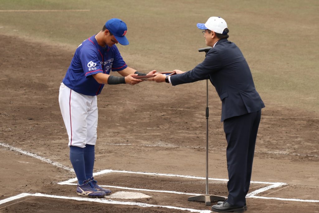 大塚外野手(主将)が東海地区代表盾を受け取りました