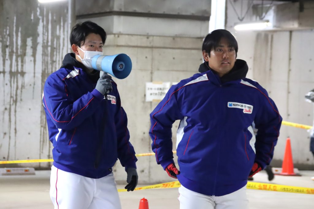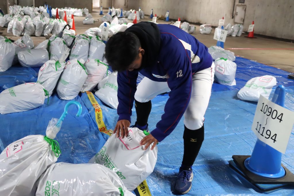 左より、23 佐々木内野手、7 宮本内野手 ランナーの手荷物をゼッケンナンバーと照らし合わせて預かりました