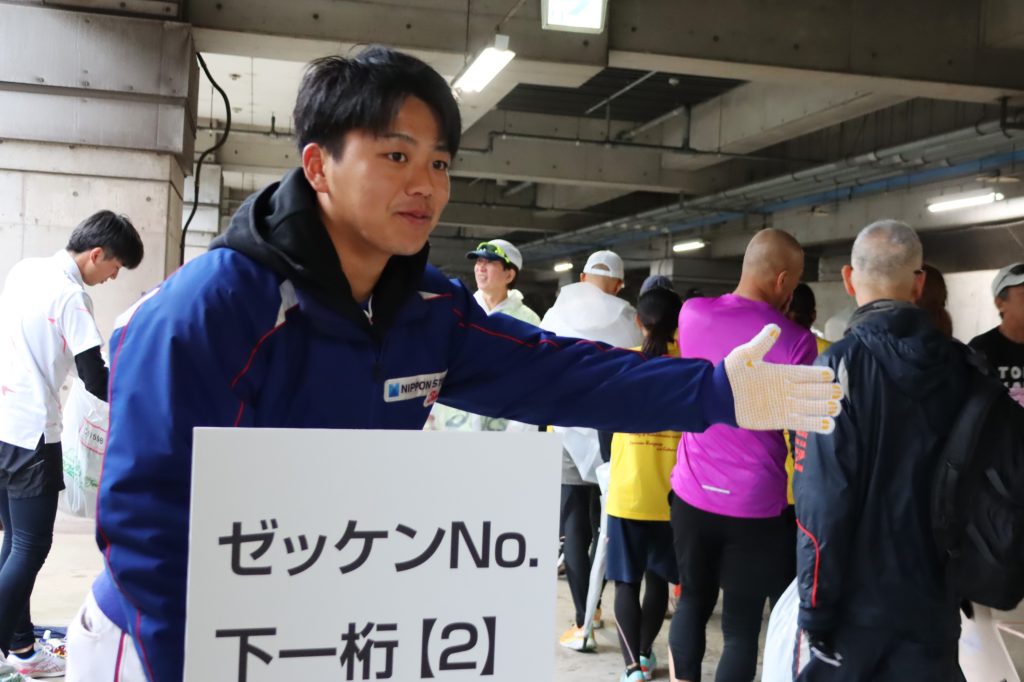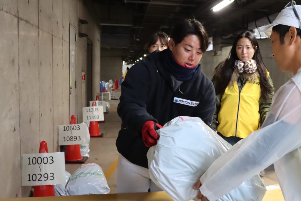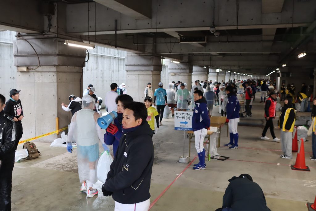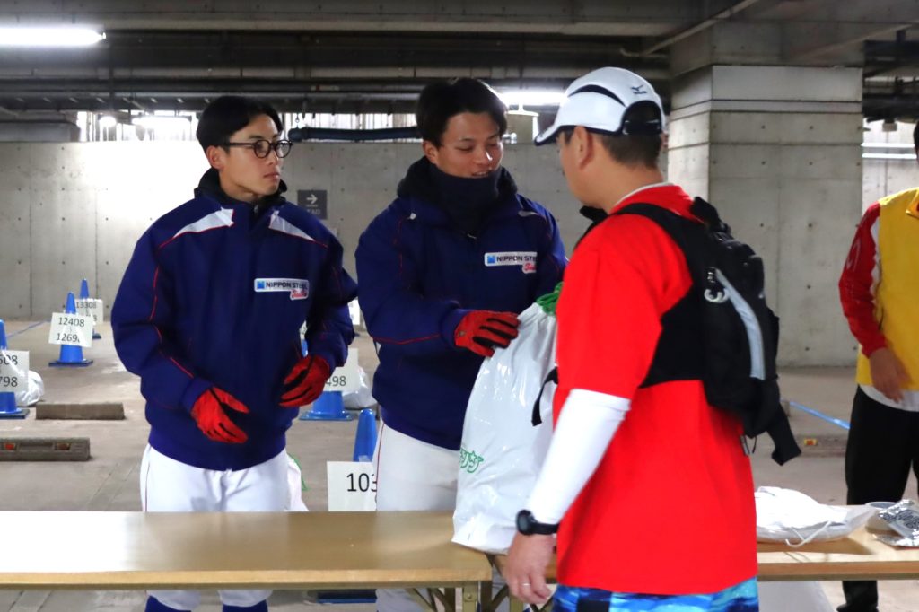 REXスタッフ・選手は、東海青年会議所・東海樟風高校の方々と協力しながら運営手伝いとして日本福祉大学地下駐車場でハーフマラソンの部の手荷物預かり窓口などを担当しました。