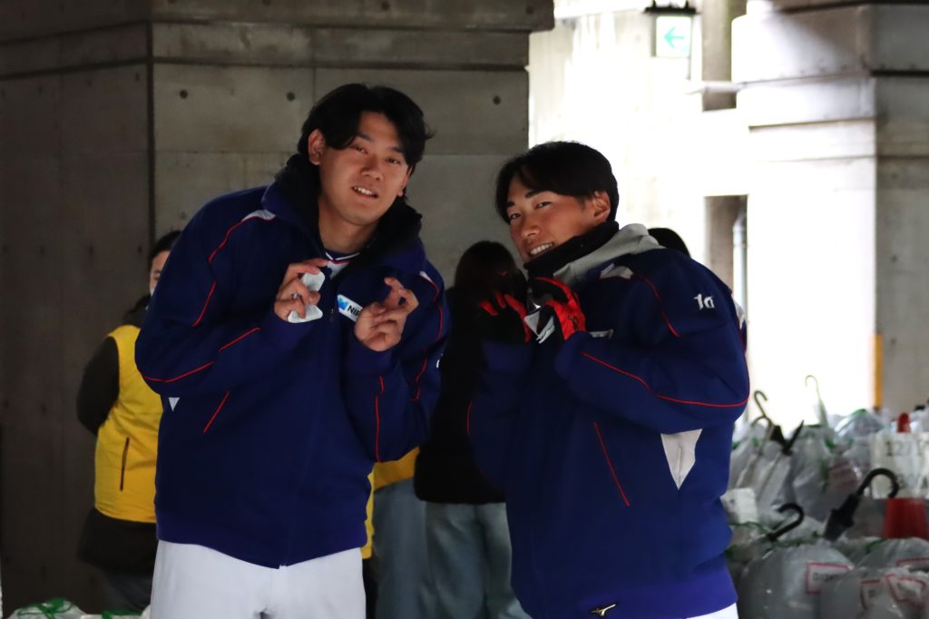 左より、17 佐伯投手、10 長南外野手。朝は小雨が降り、寒い中カイロを手に受付を頑張りました!