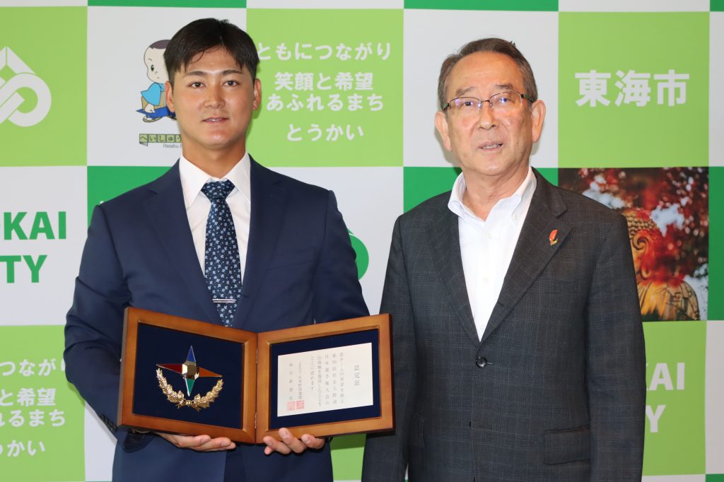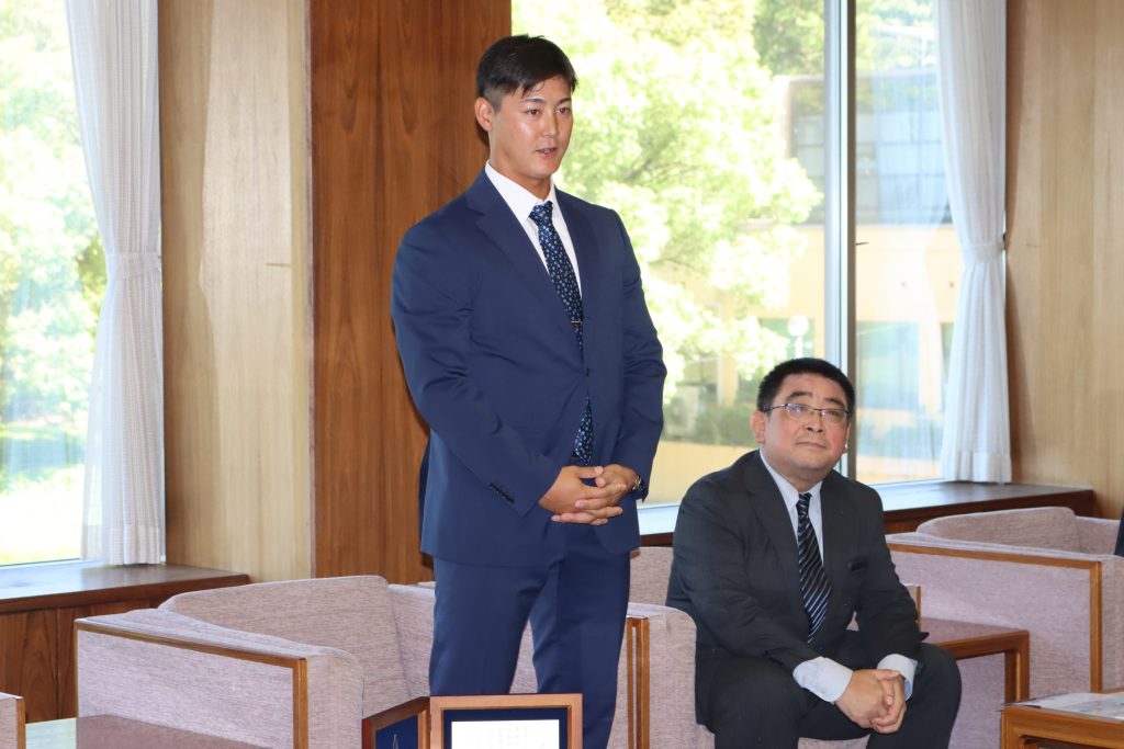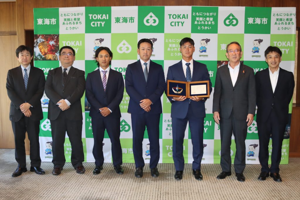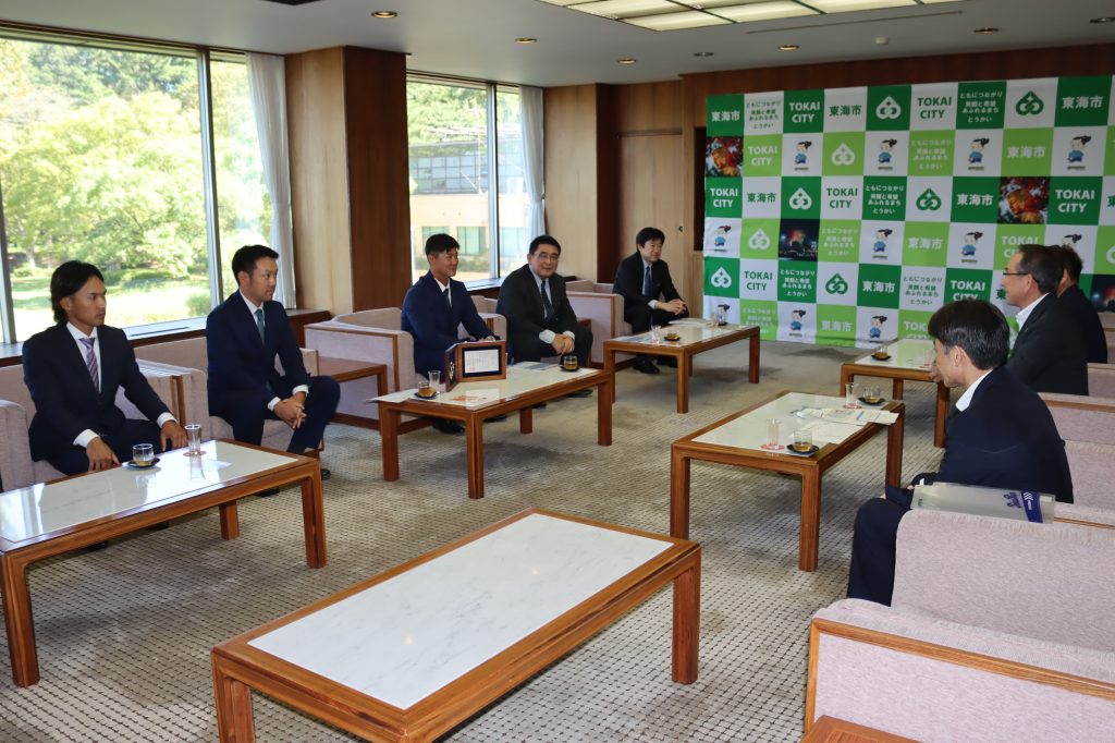 10/9(木)に中根REX理事長、平泉野球部長、鈴木監督、下村コーチ兼マネージャー、大塚主将の5名で東海市役所を訪問し、第50回日本選手権大会の代表権獲得のご報告をさせていただきました。