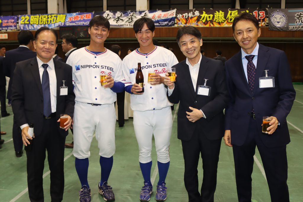 山本 昌臨時コーチ(写真左)にもお越しいただきました。選手所属企業の方々のところをまわり、ご丁寧に挨拶をしてくださいました。