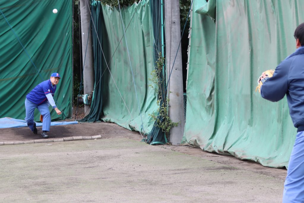 始球式を行う平光所長は、球場開き前にブルペンで投球練習をし本番に臨みました!