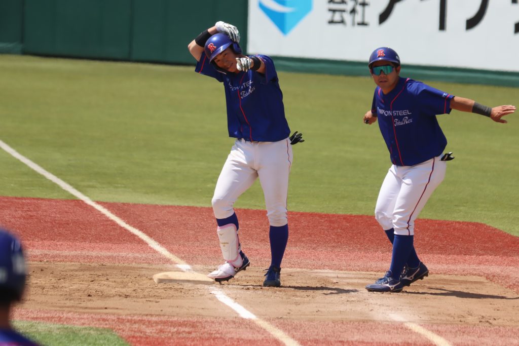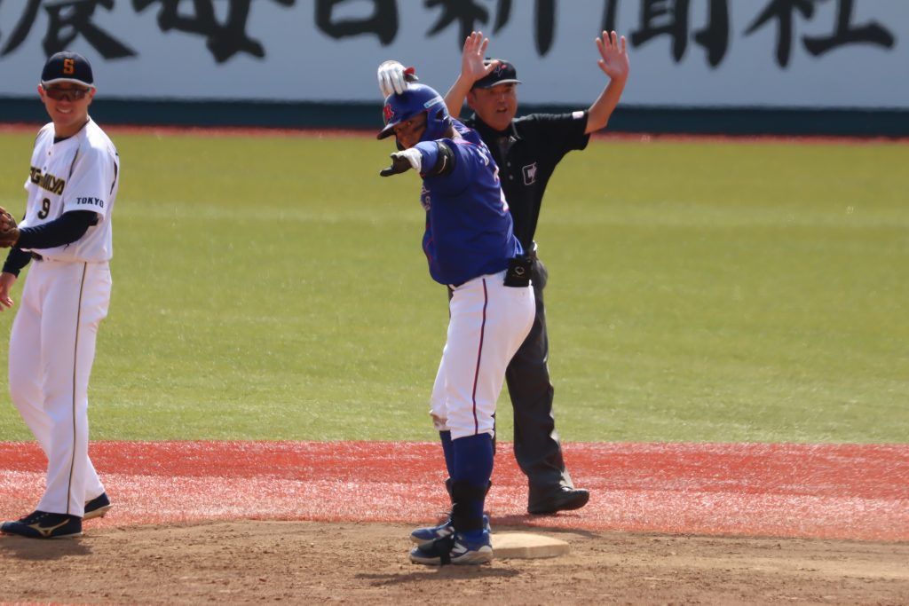 一塁コーチャーの24 宮坂内野手とともにヒット後のパフォーマンス!